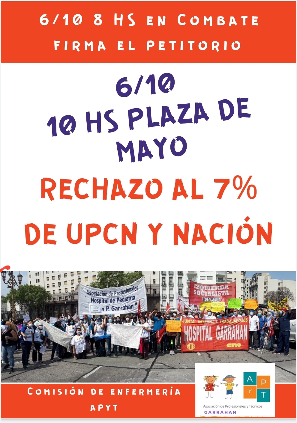 La Asociación de Profesionales y Técnicos del Hospital Garrahan repudió el acuerdo paritario de aumento de 7 % firmado ayer "en forma intempestiva" por los sindicatos UPCN y SUTECBA de esta institución. Como respuesta realizarán una protesta hoy a las 13 horas en la entrada de la calle Combate de Los Pozos. Allí se anunciarán los detalles de lo que será el paro 24 horas el próximo miércoles 21 de octubre.